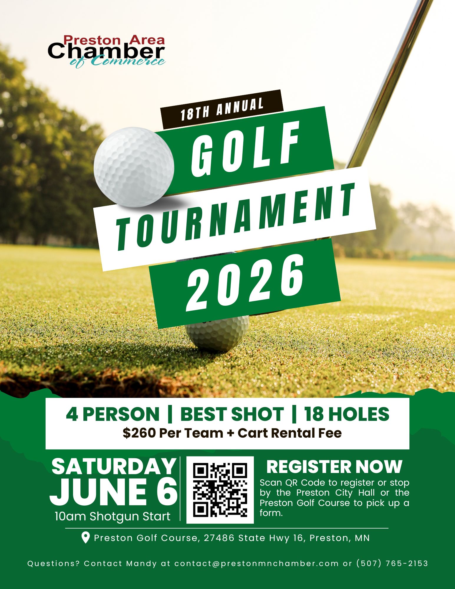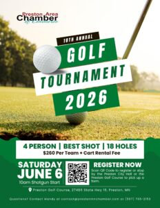 Join us at the Preston Area Chamber of Commerce 18th Annual Golf Tournament! Our Annual Golf Tournament is the perfect mix of networking, friendly competition, and hometown pride — all in support of the Preston Area Chamber of Commerce.