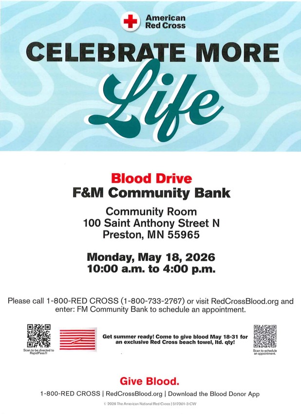 Blood Drive F&M Community Bank + Add to Google Calendar + iCal / Outlook export 00 days 00 hours 00 minutes 00 seconds Date May 18 2026 Time 10:00 am - 4:00 pm Location F&M Community Bank 100 Saint Anthony S. N, Preston MN 55965 Category Community Event Share this event