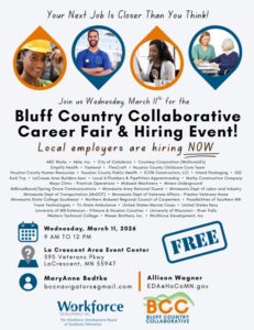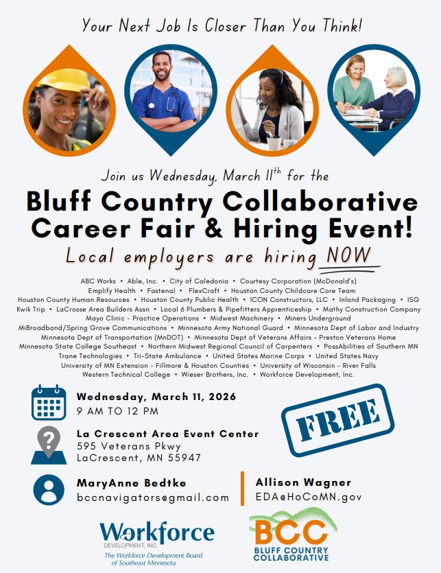 Bluff Country Collaborative Career Fair & Hiring Event More details: BCC Career Fair & Hiring Event | Facebook + Add to Google Calendar + iCal / Outlook export 00 days 00 hours 00 minutes 00 seconds Date Mar 11 2026 Time 9:00 am - 12:00 pm Location La Crescent Area Event Center 595 Veterans Pkwy, La Crescent, MN 55947 Category Community Event Share this event