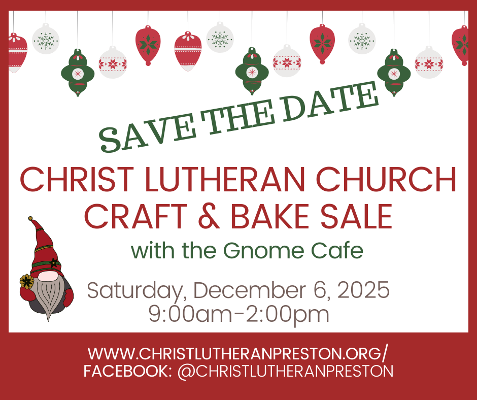 Christ Lutheran Church Craft & Bake Sale + Add to Google Calendar + iCal / Outlook export 00 days 00 hours 00 minutes 00 seconds Date Dec 06 2025 Time 9:00 am - 2:00 pm Location Christ Lutheran Church Share this event
