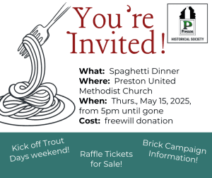 Preston Historical Society – Spaghetti Dinner + Add to Google Calendar + iCal / Outlook export The event is finished. Date May 15 2025 Expired! Time 5:00 pm - 9:00 pm Category Community Event Share this event